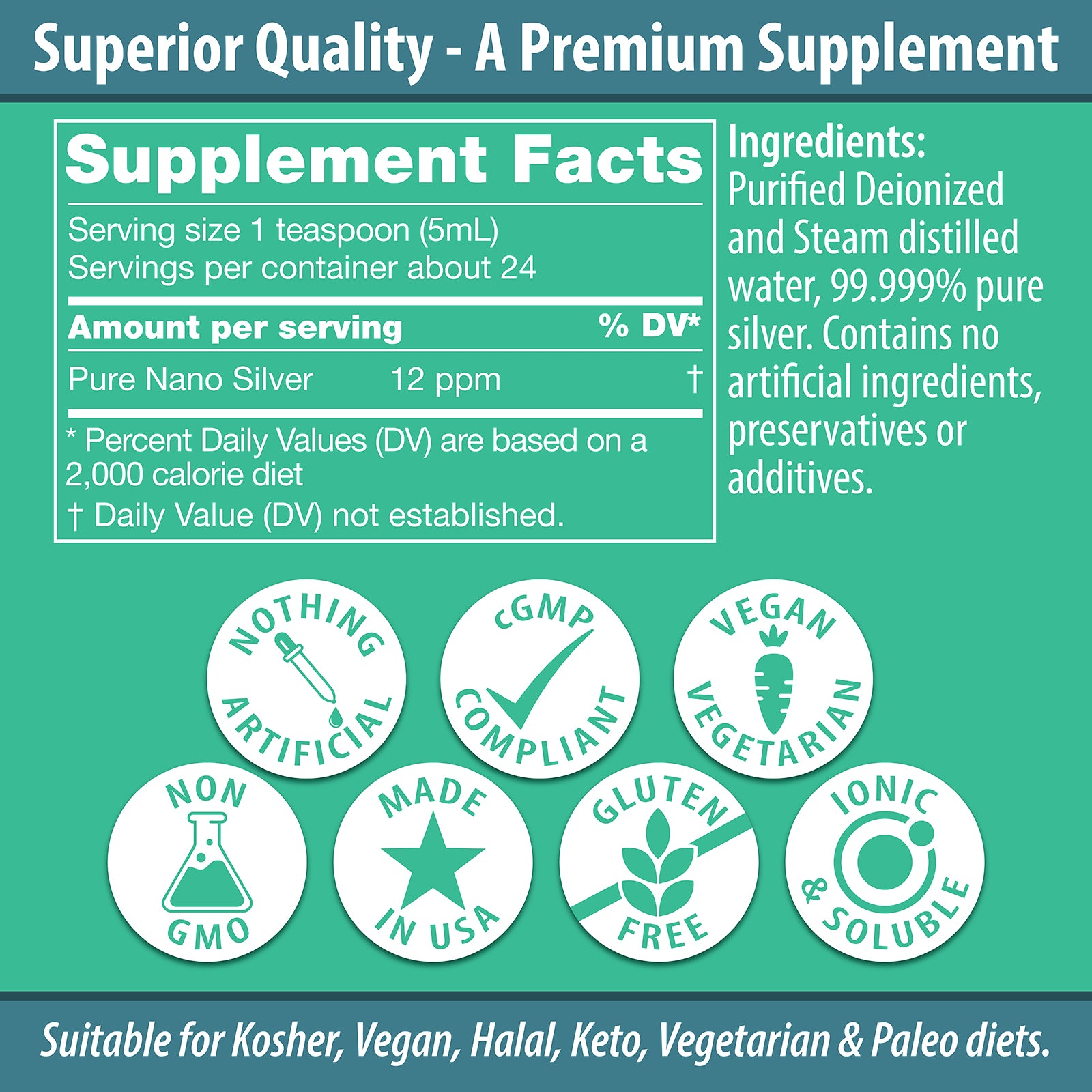 Pure and Potent: Nano Colloidal Silver, with a 12 ppm (parts per million) concentration, includes 24 servings per bottle.